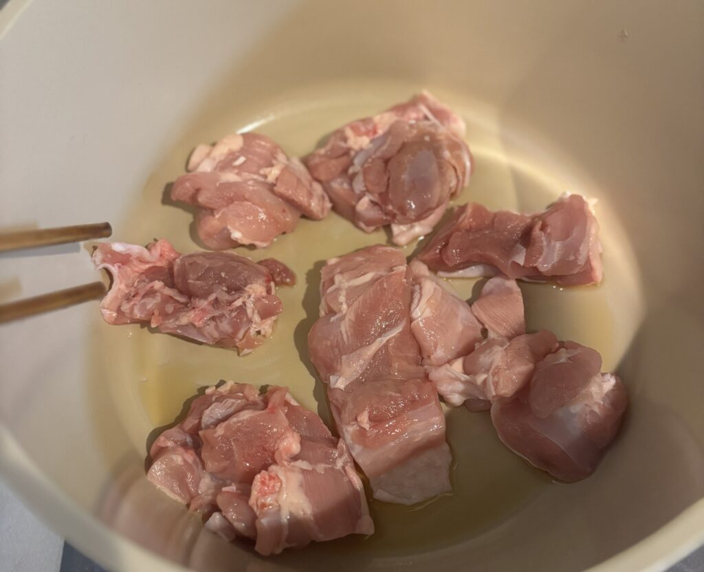 鍋にごま油を引き、カット済み鶏肉を焼きます。ここで焼き色をつけることで、香ばしさがスープに溶け出します。