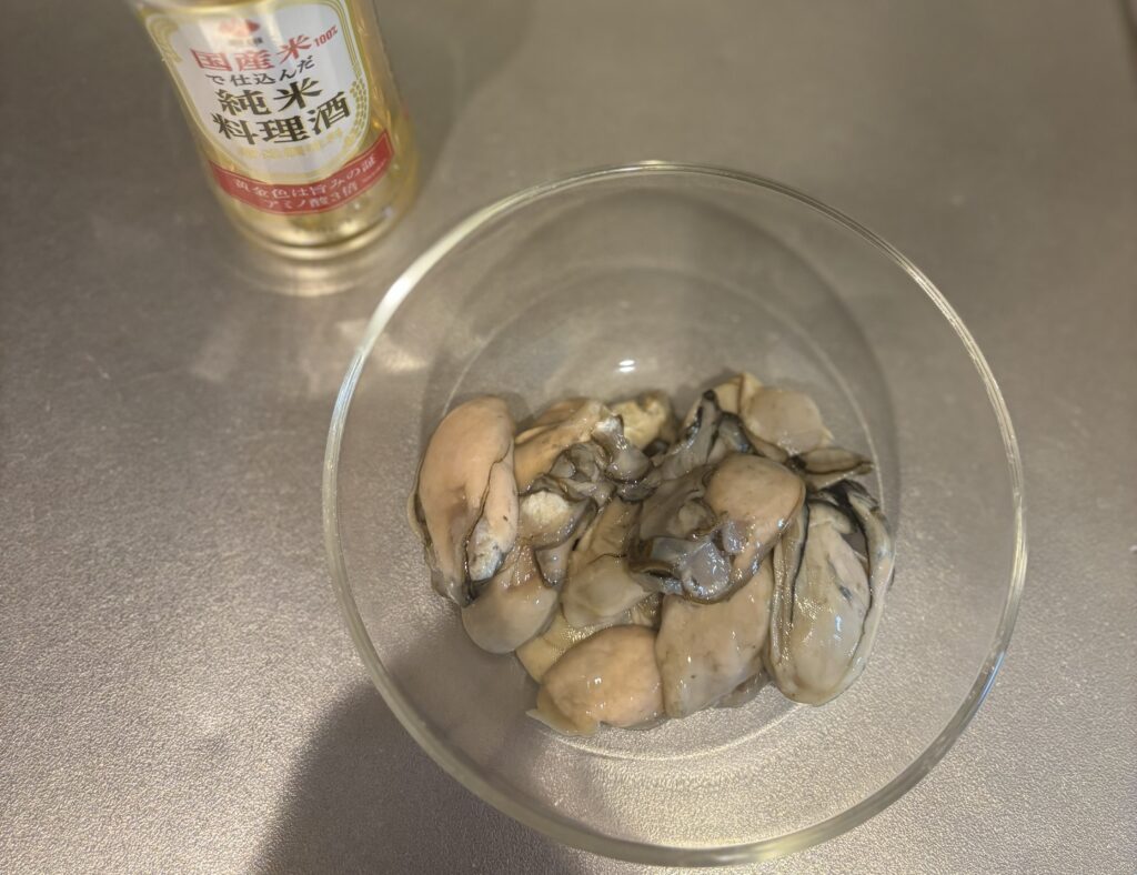 白菜はざく切り、えのきは石突を落として割いておきます。牡蠣は酒に浸けて臭みを取っておきます。