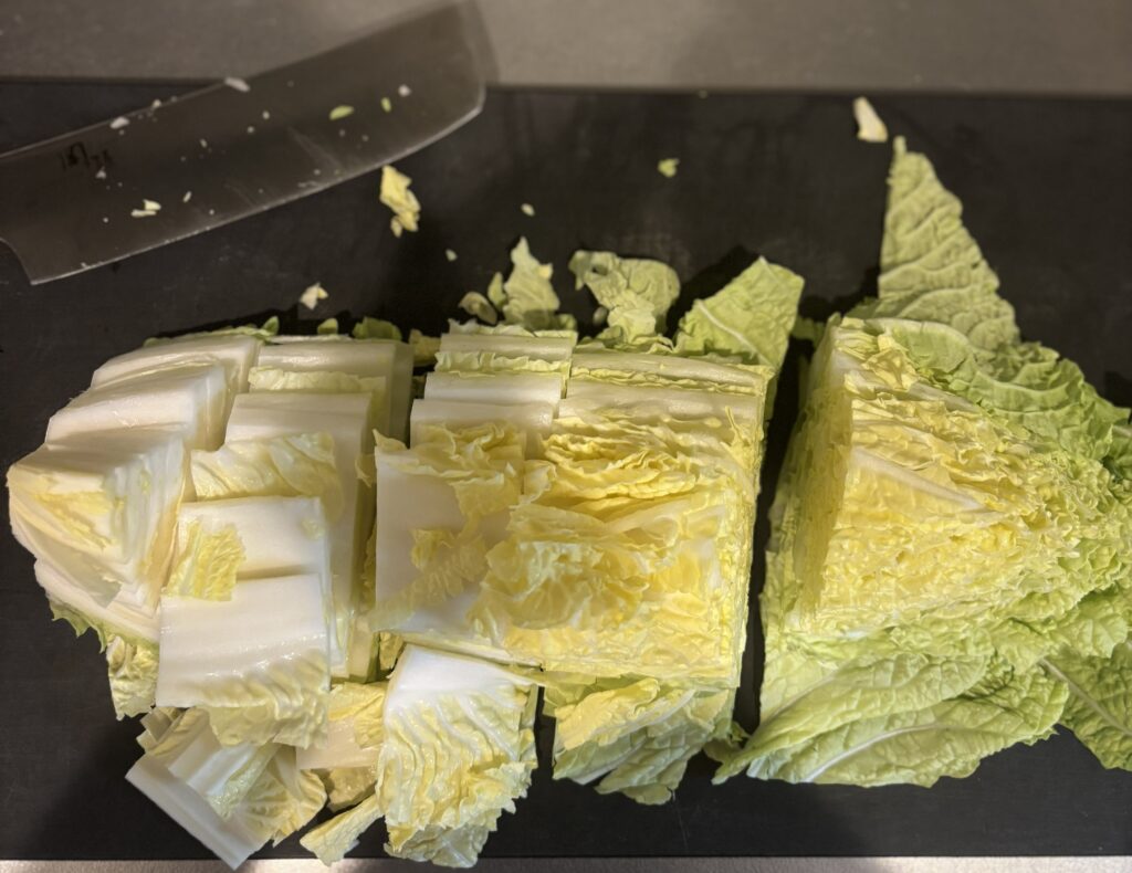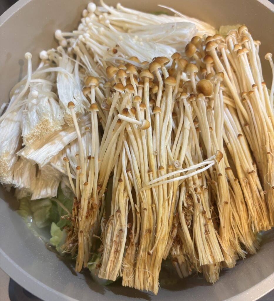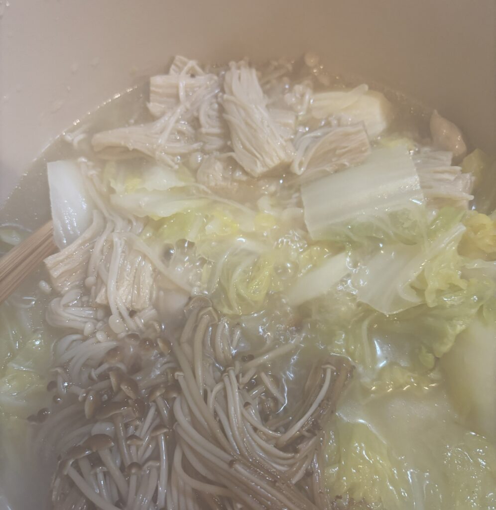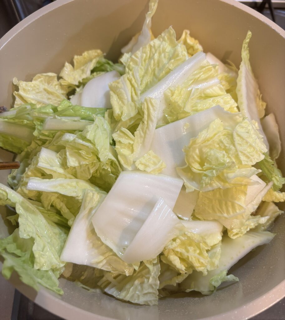 焼き色がついたら、水、白菜、きのこ、だしの素を投入。ある程度火が通ったら、一旦火を止めて放置します。