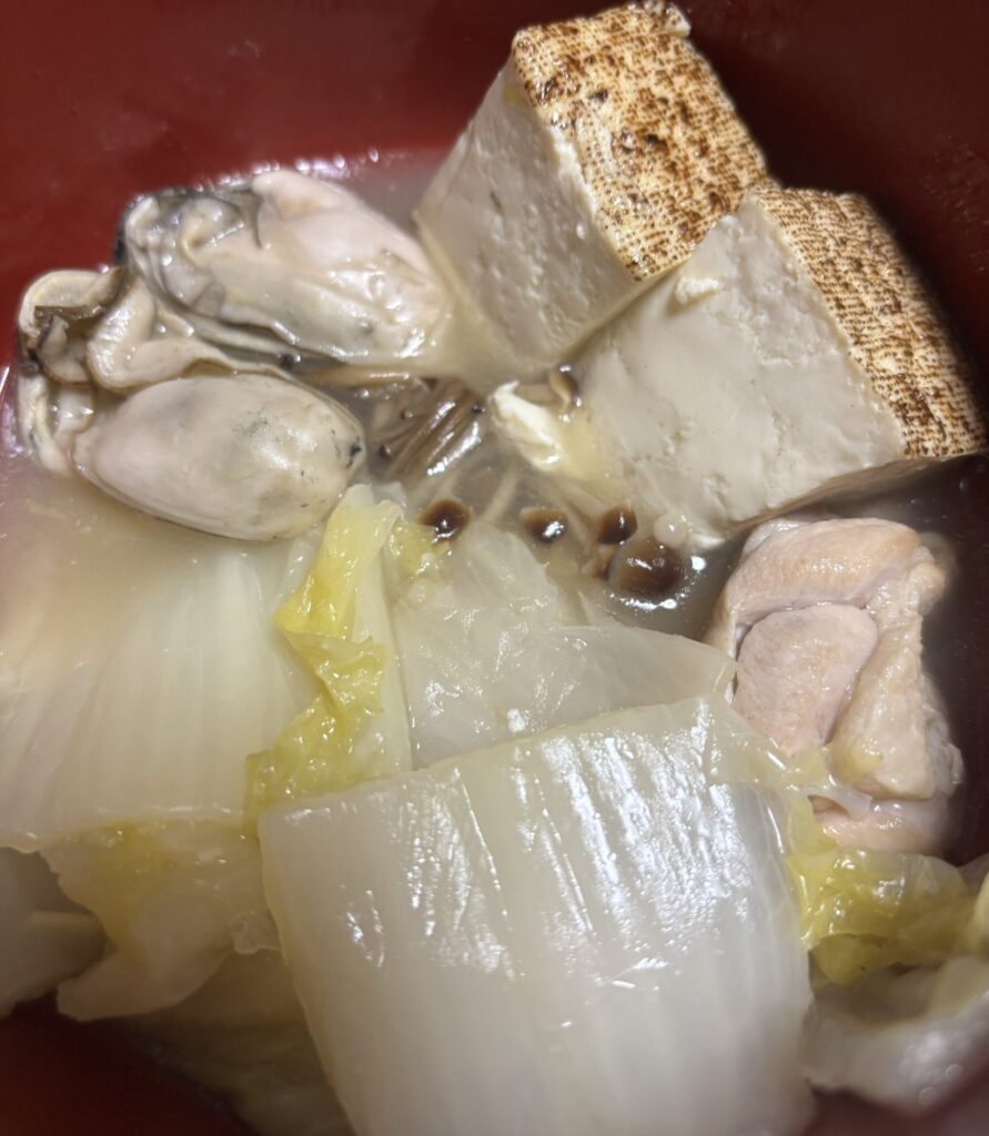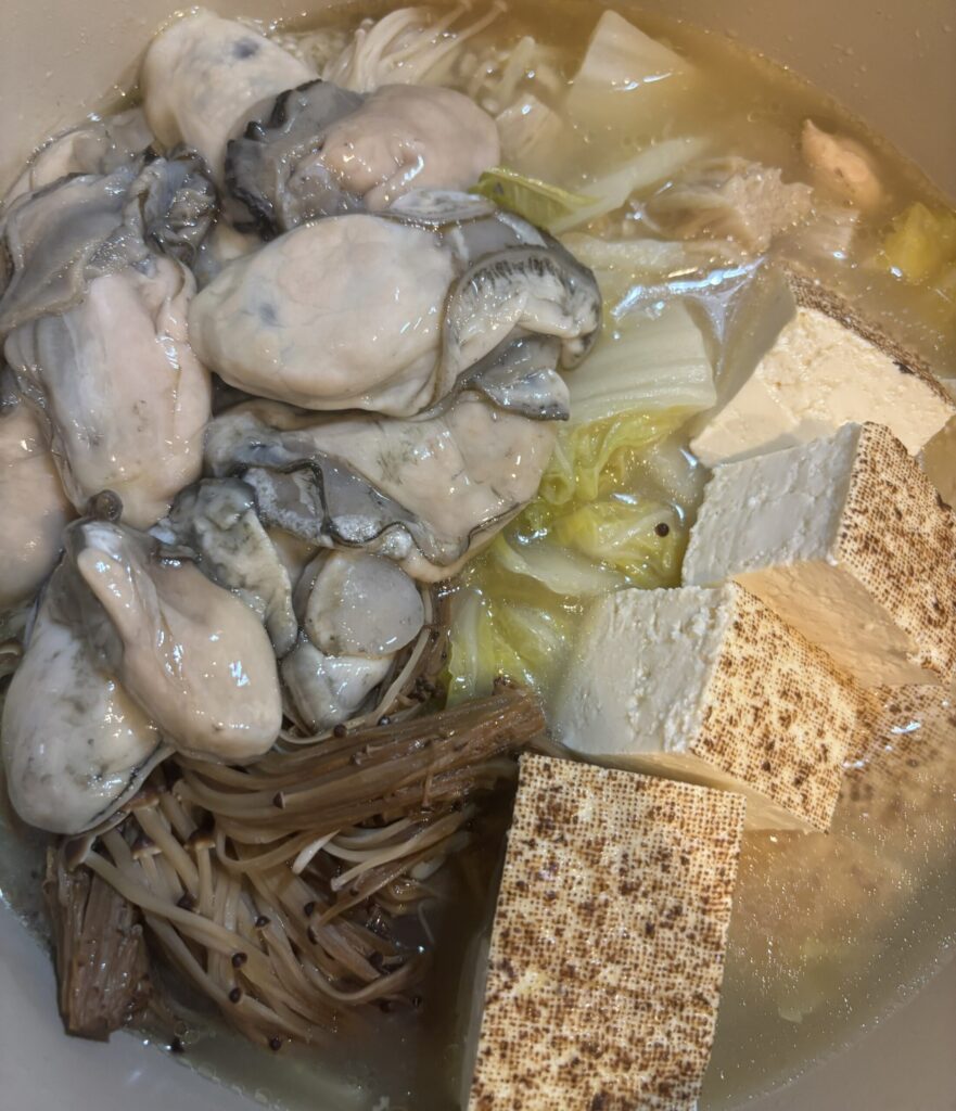 牡蠣に火が通り、豆腐が温まれば完成!好みでポン酢をつけていただきます。鶏ときのこの旨味、そして牡蠣の出汁が合わさったスープは格別です。