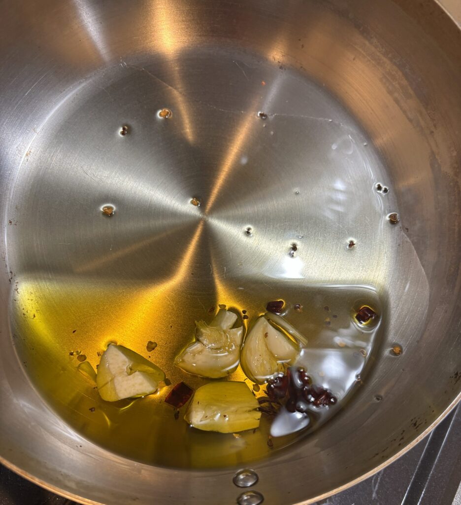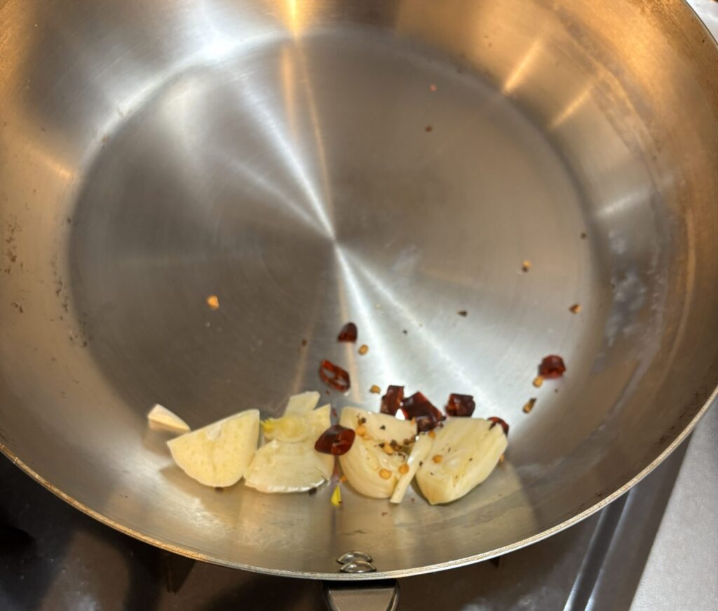 • にんにく・唐辛子をフライパンに入れておく