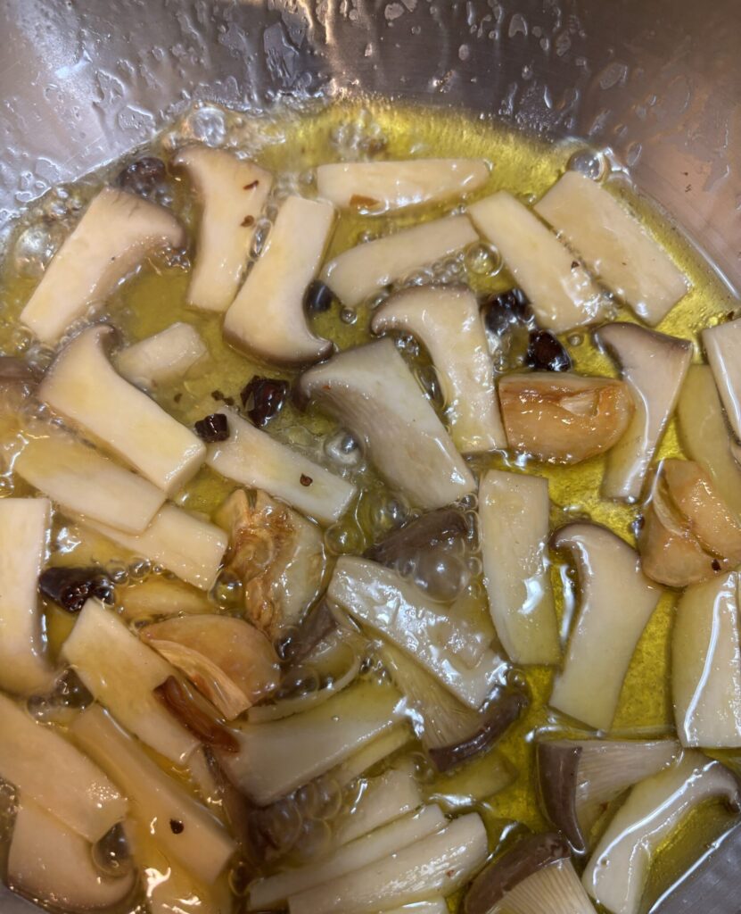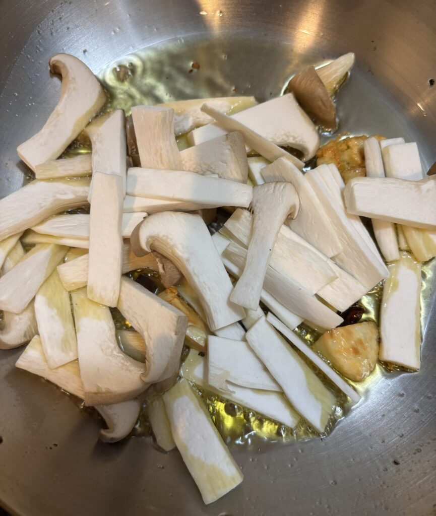 にんにくが色づいてきたら、エリンギを投入。