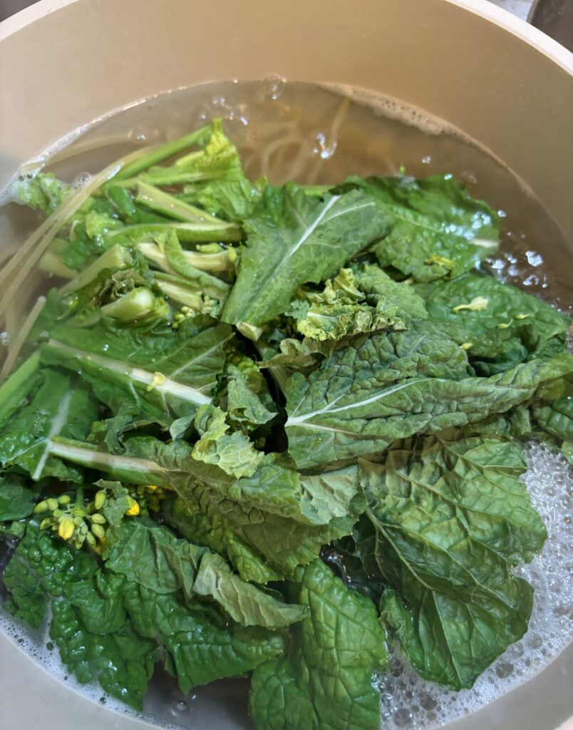 • 茹で時間残り3分で菜の花を鍋へ